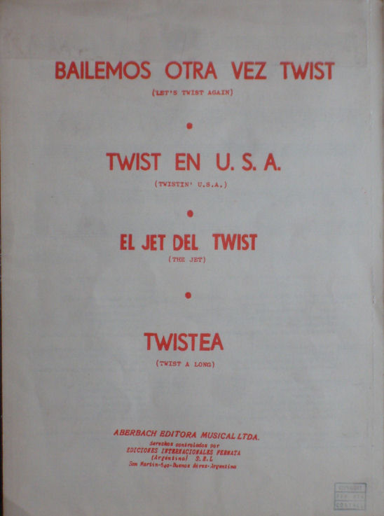 Das hier gezeigte Cover stammt original aus Argentinien und wurde durch Aberbach Editora Musical Ltda. Buenes aires herausgegeben. Es wurde am 4 Juli 1962 gedruckt. Diese Aufdruck befindet sich links unten in der Ecke. Das original Copyrecht liegt bei Gladys Music Inc. eine Tochtergesellschaft von Aberbach. Das zweiseitige bedruckt Sheet beinhaltet auch die Übersetzung aus dem englischen ( amerikanischen) ins spanischen. Im Refrain heisst es dann ( Übersetzt auf Deutsch) ; " Rock... el ritmo del amooor !.... (Rock... das Rhytme der Liebe!...) | ||||||||||||||||||||||||||||||||||||||||||||||||||||||||||||||||||||||||||||||||||||||||||||||||||||